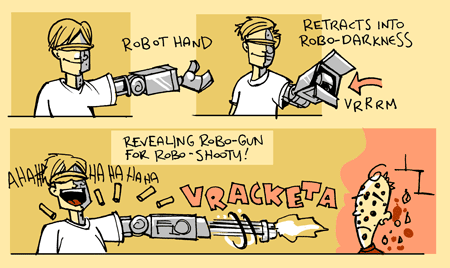 Now, what I want to direct your attention to is Robodude, second from right. Half-man, half-robot, his robot arm stored several different instruments in its indeterminate robospace, as follows: